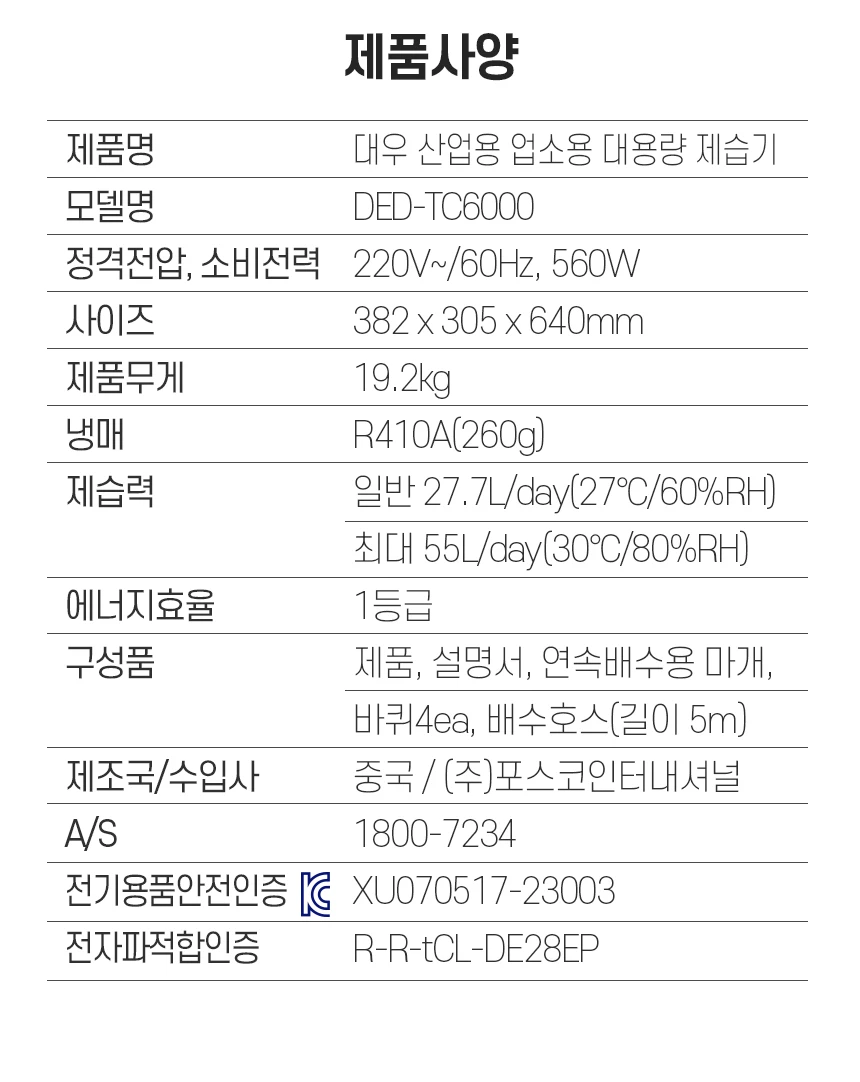 대우 1등급 업소용 대용량제습기 55L 반지하 산업용 습기제거 제습기 DED-TC6000